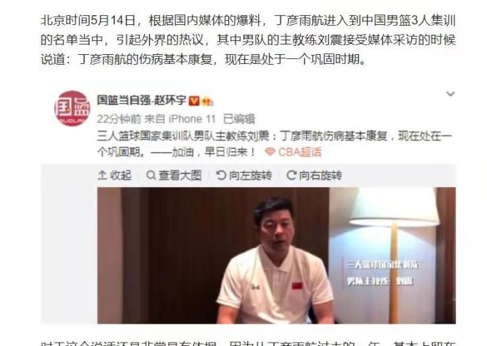 近期,中国男篮3X3国家队公布了集训名单,丁彦雨航再一次入选,这也引起了很多球迷的关注,丁彦雨航的状态如何,到底还能不能打?或许能给给出权威答案的只有带着丁彦雨航训练的主教练刘震了。