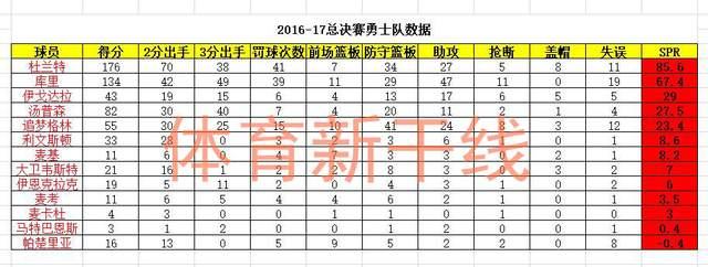 这个赛季是杜兰特加盟勇士的第一年,他们在总决赛战胜骑士,而杜兰特也凭借统治级的表现力压库里夺得了FMVP,如果用CBA的SPR值公式计算,杜兰特的SPR值达到了85.6,位列全队第一。库里则是67.4,位列全队第二。伊戈达拉29位列第三,汤普森27.5位列第四,追梦格林23.4位列第五。NBA的评选结果与CBA的SPR计算公式相吻合。