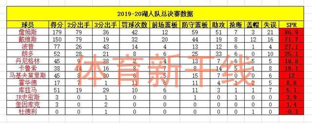 而值得一提的是,作为湖人队对手,热火全队SPR值最高的则是巴特勒,他的SPR值达到90.1,这个数据甚至超过了詹姆斯,所以,如果去年热火夺冠,巴特勒将是无可争议的FMVP获得者,而热火队中位列第二的是邓肯罗宾逊,他的SPR值为42.6,第三则是克劳德,数值为27.2,奥利尼克26.7第四。被认为打出超新星身价希罗,SPR值只有4,位列全队倒数第三。
