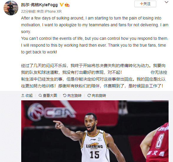 24直播网讯 5月6日,距离CBA总决赛已经过去5天的时间了,最终获得亚军的辽篮外援弗格在社交媒体上道歉,他表示: