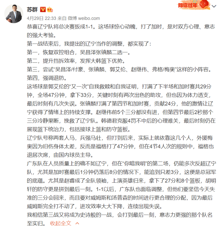 苏群更是发长文给辽篮支招,他们需要保持并且继续调整,比如做好退防,适当使用一大四小的阵容,增加挡拆利用韩德君的优势等等,并且下定论“我相信第三战又将成为史诗般的一战,会打到最后一刻,意志力更强的那个队名至实归。”的确,辽宁把该调整的都调整了才险胜,下一战太难预料了!