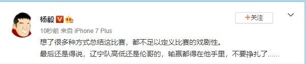 接下来的G3还必须要拼,赛后杨毅发微博并与网友互动“想了很多种方式总结这比赛,都不足以定义比赛的戏剧性。最后还是得说,辽宁队高低还是伦哥的,输赢都得在他手里,不要挣扎了......输赢都在他手里。要是赢赢他手里,要是输也输他手里。”这正诠释了领袖对一支球队来说的作用,超过了外援。郭艾伦还是要承担起进攻重任,与此同时还要尽力带动队友!