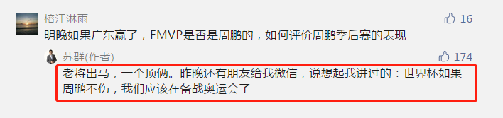 有球迷提问,“如果广东赢了,FMVP是否是周鹏的,如何评价周鹏季后赛的表现”。而苏群老师回应,“老将出马,一个顶俩。昨晚还有朋友发消息,说我曾经说过,如果世界杯周鹏不伤的话,我们应该在备战奥运会了”。