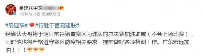 或许是众人不看好的原因,4月25日,易建联个人网站宣布,易建联将在周一(4月26日)前往浙江诸暨和广东男篮汇合,值得一提的是,或许是为了避免其他队球迷过多联想,在这则报道中也特别标明了易建联不会上场,只是前往加油。