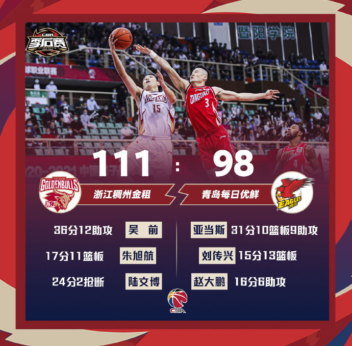 浙江111-98战胜青岛 吴前36+12 陆文博24分 亚当斯31+10+9
