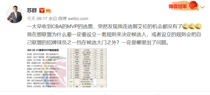 关于郭艾伦没入选MVP行列候选人,官方解释他贡献值不如赵继伟,一队只能选一人,所以赵继伟入选,对此也引发了全网热议!苏群发微博“一大早收到CBA的MVP的选票,突然发现我连选郭艾伦的机会都没有了。我在想联盟为什么要一定要设立一套规则来决定候选人,或者设立的规则会把自己联盟的招牌球员之一挡在候选大门之外?一定是哪里出了问题。”