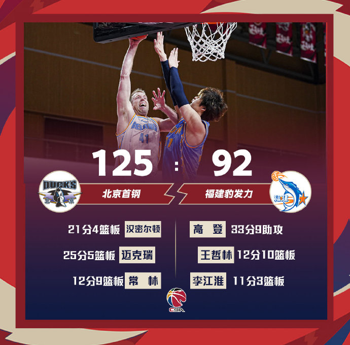 北京125-92大胜福建 迈克瑞25+5 张才仁18分 高登33+9