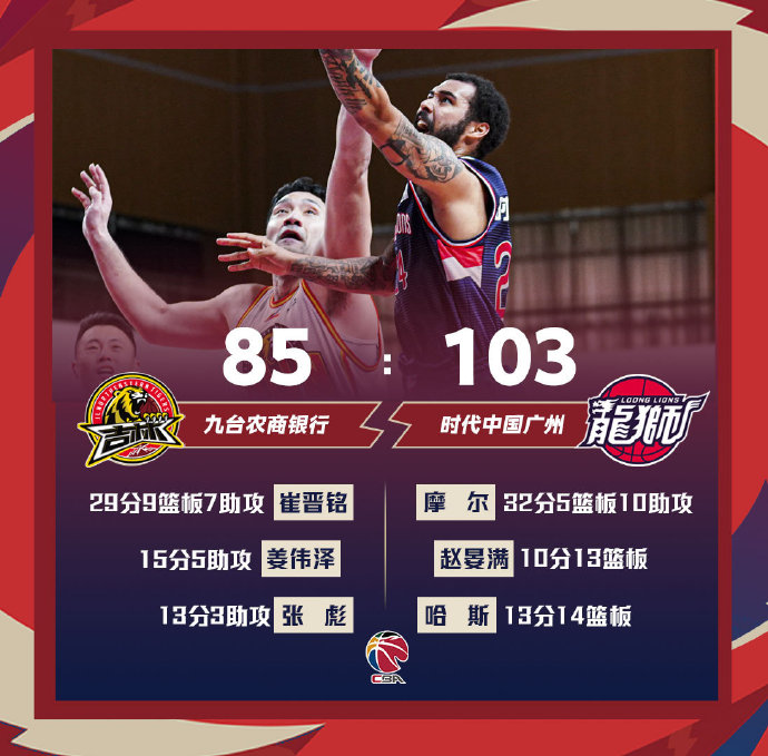 末节,田宇恒全速推进,赵宴满跟进上篮得手。李安手递手给到崔晋铭,后者直奔篮下打成2+1。吉林连续外线转移,代怀博三分线外出手命中。摩尔直杀内线,空中躲开防守,将球打进。广州打出快速反击,陈盈骏底角三分命中。临近本节结束,广州打出一波7-0,奠定胜局。全场比赛结束,吉林85-103不敌广州。