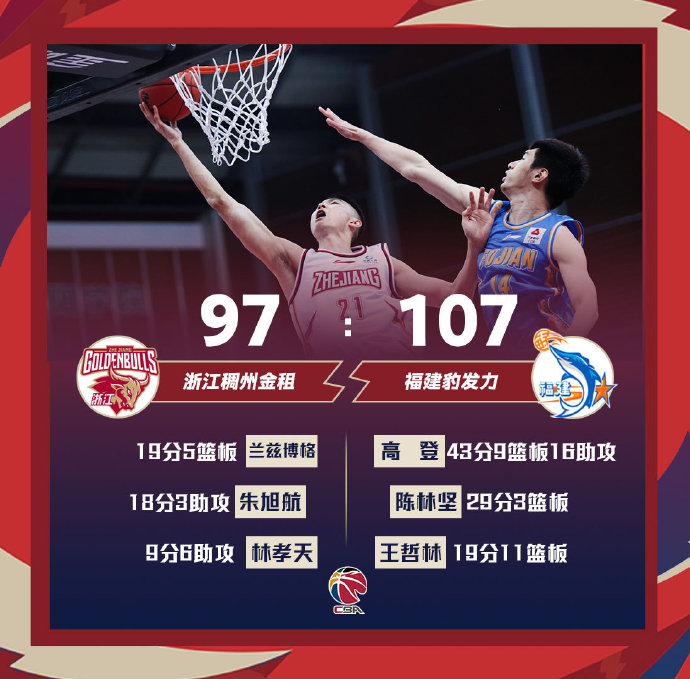 福建107-97力克浙江 高登43+9+16 陈林坚29分 朱旭航18分