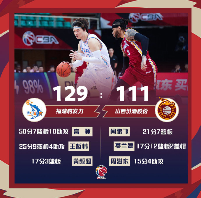 福建129-111战胜山西 高登50+10+7 王哲林25+9 闫鹏飞21+6