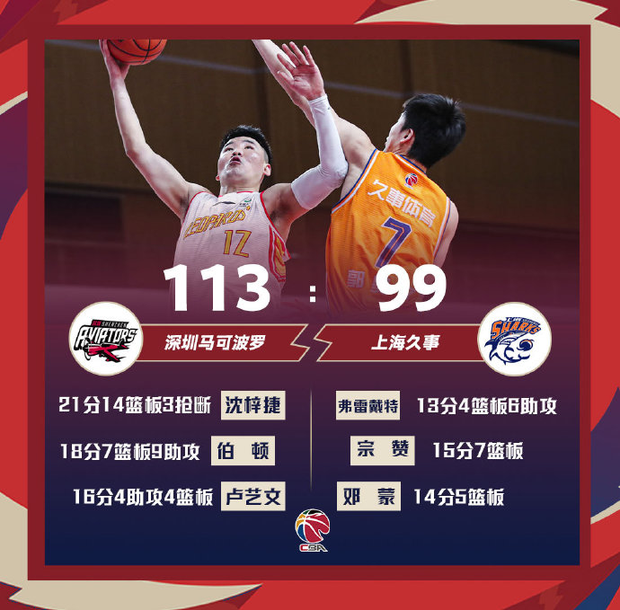 末节,弗雷戴特突破助攻区俊炫轻松吃饼,于梁干拔三分稳稳命中。白昊天突破助攻沈梓捷双手暴扣,郭昊文助攻区俊炫轻松上篮打进。伯顿突入篮下再取两分,比赛就此失去悬念,深圳拿下比赛。全场比赛结束,深圳113-99上海。