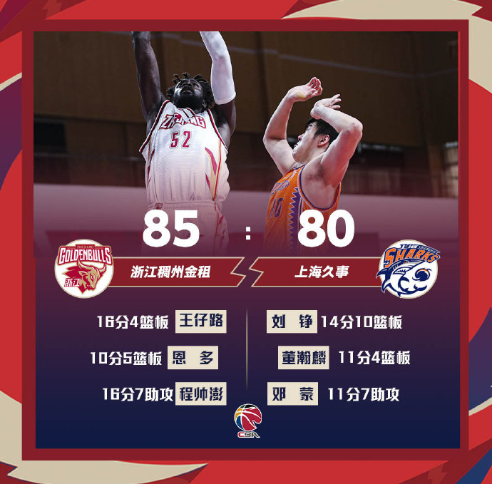 浙江:程帅澎16分6板7助3断,林孝天13分2板5助,赖俊豪4分8板2助2断2帽,恩多10分5板,王仔路16分4板2助,张大宇4分2板,兰兹伯格10分3板,拉科塞维奇10分10板