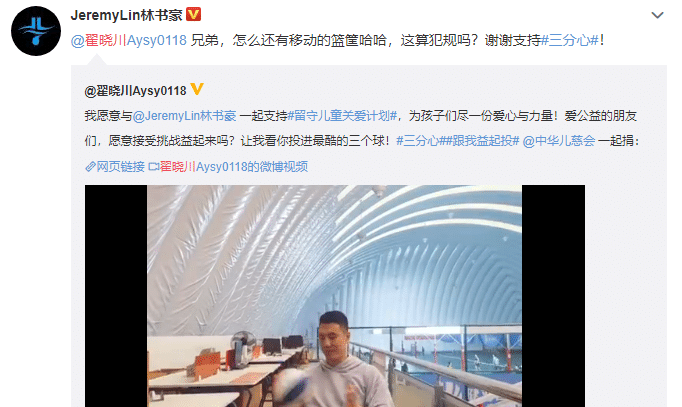 翟晓川养伤期间也没有闲着,他也参加了很多活动,这其中就包括了挚友林书豪发起的“留守儿童关爱计划”,投出最帅的三个球,此前已经有吴建豪、陈建州、邓紫棋等明星参与进来,这次到了篮球圈的翟晓川,他也接受挑战,响应好友的活动。林书豪回复到:“翟晓川,兄弟,怎么还有移动的篮筐哈哈,这算犯规吗?谢谢支持三分心!”