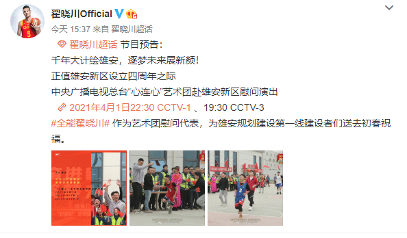 除了响应林书豪活动和直播带货之外,翟晓川还作为艺术团慰问代表,为雄安规划建设第一线建设者们送去初春祝福,这是翟晓川工作室发布的内容,千年大计绘雄安,逐梦未来展新颜,正值雄安新区设立四周年之际,翟晓川作为艺术团慰问代表,将会从体育频道亮相到综艺频道,完成跨界。