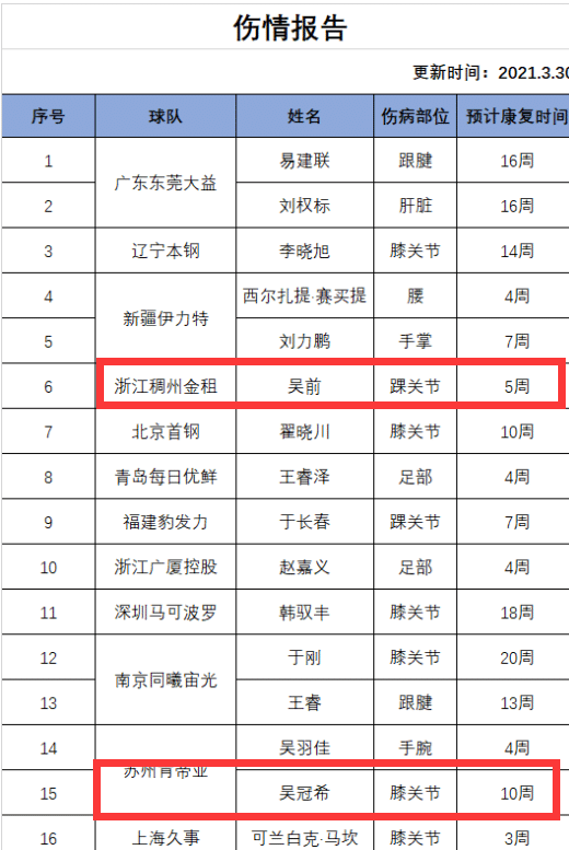 另外在伤病报告中新增的球员还有吴冠希,此前江苏男篮已经官方宣布吴冠希赛季报销。报告显示吴冠希膝关节出现伤情,预计康复时间是10周。当然对于江苏来说,吴冠希的缺席,有可能让他们遭遇赛季垫底的厄运。