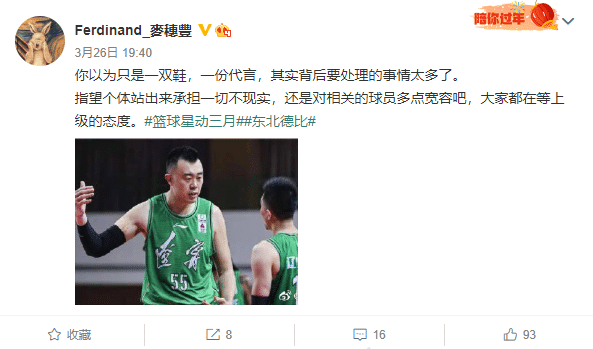 对此,篮球先锋报记者Ferdinand_麥穗豐解读道:“你以为只是一双鞋,一份代言,其实背后要处理的事情太多了。指望个体站出来承担一切不现实,还是对相关的球员多点宽容吧,大家都在等上级的态度。”