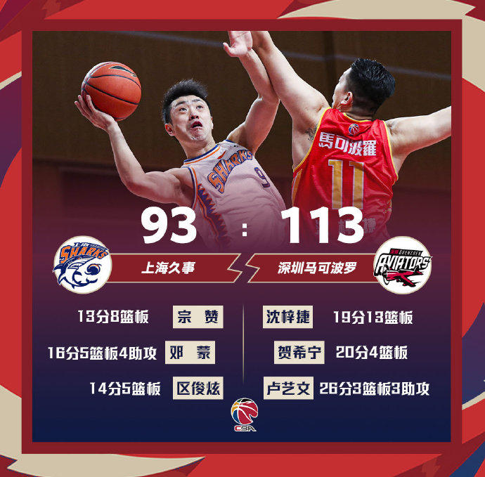 深圳113-93大胜上海 梓捷19+13+4帽 卢艺文26分 贺希宁20分