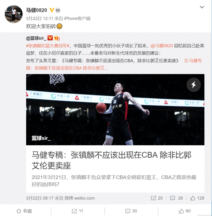 24直播网3月24日讯 ,国内篮球名嘴同时也是昔日NCAA第一位中国球员马健老师,在自己的个人社媒专门写了一篇文章来评价张镇麟!