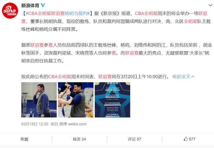 24直播网3月19日讯 ,据国内多家媒体爆料,CBA全明星周末将进行“联谊赛”由裁判、主教练和球员组队,混编进行比赛,担任裁判的是姚明!