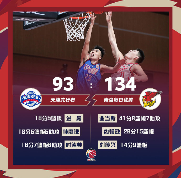 青岛134-93大胜天津 亚当斯41+8+7 约翰逊29+15 时德帅16+7+6