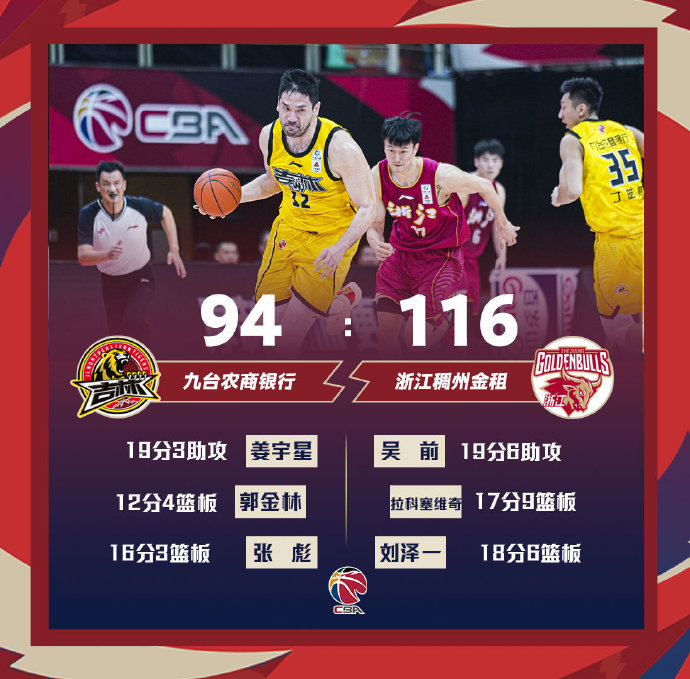 末节,崔晋铭突入篮下上篮打进,林孝天助攻刘泽一轻松上篮。刘泽一篮下强起打板上篮,丁浩然转身勾手打进。刘泽一篮下再拿4分,随后双方互有攻守,无奈分差过于悬殊,浙江轻松收下比赛。全场比赛结束,吉林94-116浙江。