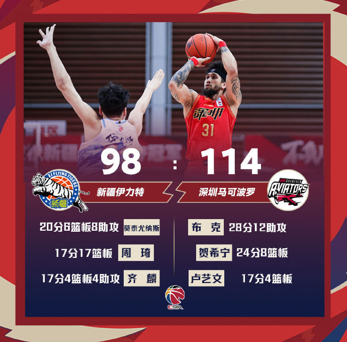 深圳(22-17):布克28分2篮板12助攻,贺希宁24分8篮板3助攻2断,卢艺文17分4篮板3助攻,顾全14分4篮板,伯顿10分,杨林祎10分3篮板,沈梓捷9分12篮板2助攻3断3帽,买尔丹2分2篮板