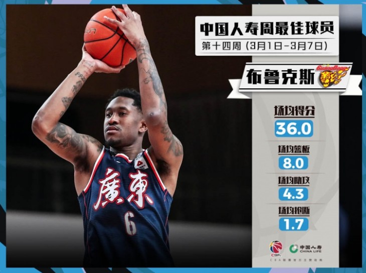 广东东莞大益球员布鲁克斯在三场比赛中,场均拿到了36分8次篮板和4.3次助攻,并有场均1.7次抢断。