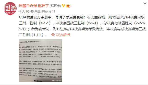 这是根据知名篮球人赵环宇的报道,称:CBA联赛官方手册中,写明了季后赛赛制:若为主客场,则12进8与1/4决赛采取三战二胜制(1-1-1),半决赛五战三胜制(2-2-1),总决赛七战四胜制(2-2-1-1-1);若为赛会制,则12进8与1/4决赛皆为单败淘汰,半决赛与总决赛皆为三战二胜制(1-1-1)。