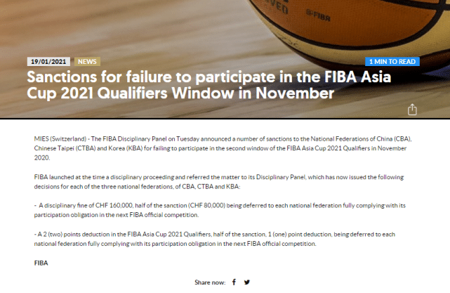 24直播网讯 北京时间1月20日消息,来自FIBA官方公告,包括中国篮协在内的3个亚洲篮协,因为没能在2020年11月参加于卡塔尔举办的亚洲杯资格赛而被各自罚款16万瑞士法郎(约116.8万人民币),并各自被扣除在亚洲杯资格赛赛事上2分。若上述被罚篮协的球队在接下来能准时参加FIBA的官方赛事,那么罚款和罚分都将减半。这一消息引发球迷热议,球迷纷纷吐槽FIBA明目张胆抢钱。