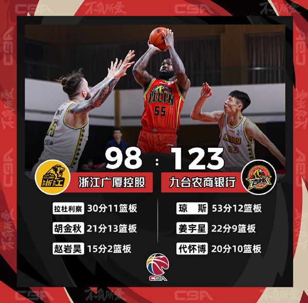 CBA简报:吉林123-98大胜广厦 琼斯53+12+7