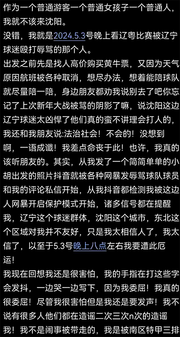 这位女球迷还在社交媒体上发布超长的文字,内容可以总结为自己高价购买黄牛票、被很多辽宁男篮的球迷咒骂和殴打,殴打她的是两个施暴者(孙某以及徐某,还有很多帮手等等,甚至在自己报警之后还被围着,甚至还求了宏远球迷联盟的肖律师。(如今该女球迷的社媒已经将控诉的内容删除+关闭评论)