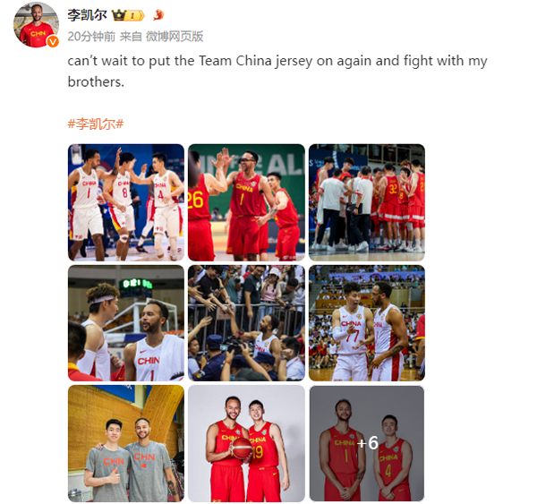 该经纪人还表示:“李凯尔多次公开表示,他一直心系中国、心系中国男篮,并在重要比赛时愿意再次为中国和中国男篮效力,与队友们并肩战斗。他在社交媒体上常与中国男篮多名队员保持积极良好的互动,并在NBA比赛期间多次在公开场合对中国球迷表现出友好,为球迷签名中国男篮队服等。