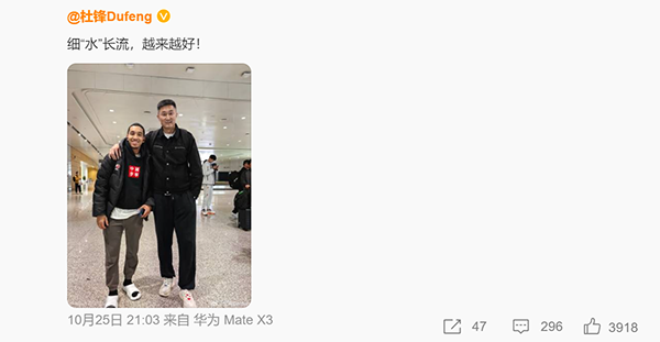 广东男篮的主帅杜锋在社交媒体上晒出自己和沃特斯的合影,称:细“水”长流,越来越好!