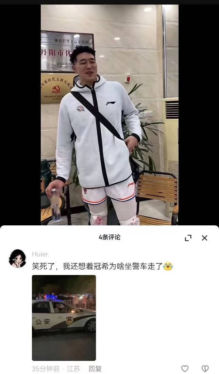 所幸的是,吴冠希这边的情况也被热心的警察叔叔发现,在了解到吴冠希的情况后,警察叔叔也是驱车将吴冠希送回了新疆男篮下榻的酒店,这也才有了吴冠希被警察带上警车的一幕。