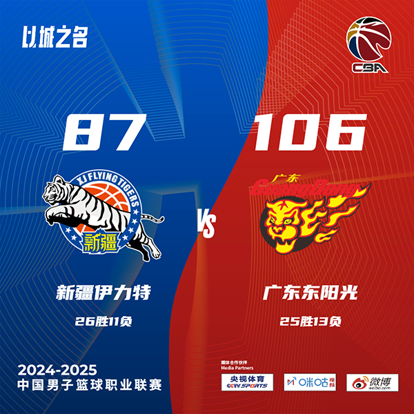 24直播网讯:北京时间3月10日,2024-2025赛季CBA常规赛第38轮迎来焦点比赛“疆粤大战”,新疆队主场迎战广东队,赵睿生涯首次战旧主。最终,广东队客场以106比87大胜新疆队19分。