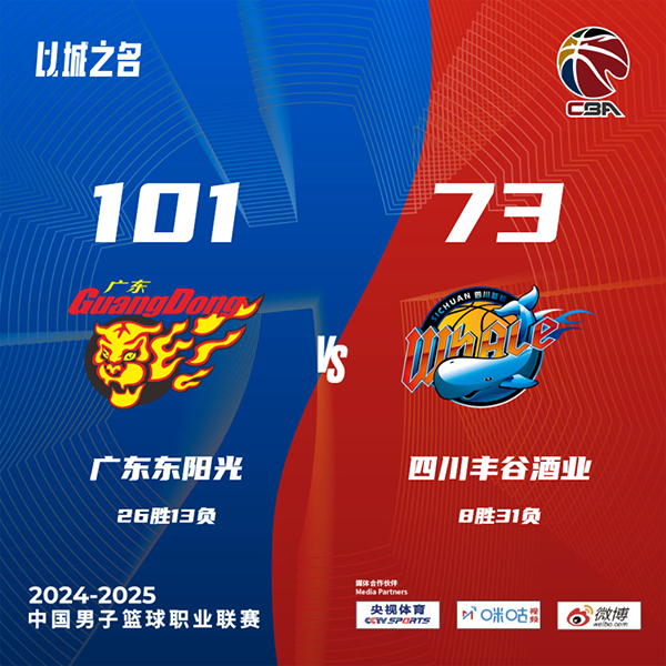 末节,广东东阳光稳稳掌控比赛节奏,始终保持着领先优势,四川丰谷酒业难以找到反击机会。本节中,广东东阳光的徐昕表现不俗,贡献10分,球队最终以101-73战胜四川丰谷酒业,成功赢得比赛。