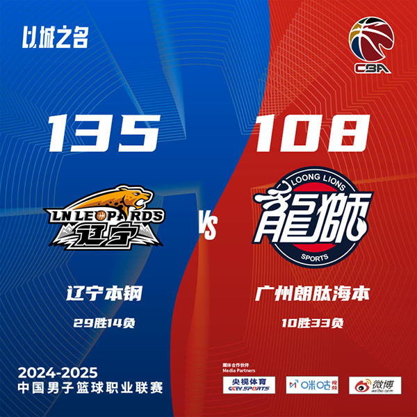 辽宁135-108横扫广州 韩德君15分&7中7 鄢手骐14分5助&5中5