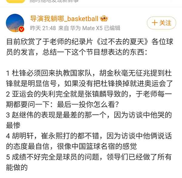 而在片子播放了7集之后,在片子中最经常被提到的人并不是乔帅而是杜锋指导,甚至胡金秋在谈到杜锋指导的时候都感动流泪了。在杜锋指导跟着上了热搜之后,知名篮球媒体人“导演我躺那”也是爆料:杜锋必须回来执教国家队,胡金秋毫无征兆提到杜锋就是明显信号,如果没有把杜锋换掉就进奥运会了。