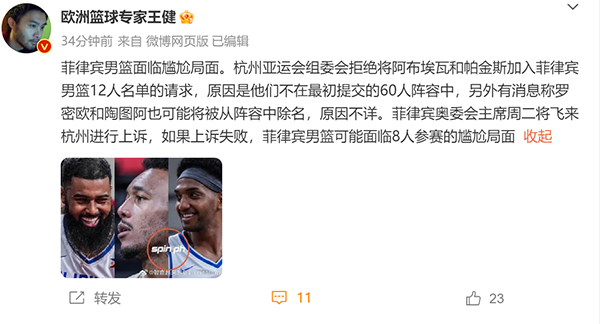 这是根据媒体人王健的报道显示,首先阿布埃瓦和帕金斯很有可能被踢出亚运会,原因是他们此前并不在菲律宾队提交的60人阵容中,杭州亚运会组委会拒绝他们参赛。同时罗密欧和陶图阿也可能将被从阵容中除名,原因不详。这样原本12人的名单,只剩下8名球员。