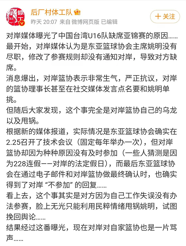 为什么呢?根据知名篮球媒体人“后厂村体工队”报道,中国台北缺席了U16世锦赛后,中国台湾篮协将问题甩锅给了姚明,让中国台湾媒体认为作为东亚篮协一把手的姚明没有尽职,在修改了参赛规则后却没有通知他们,导致中国台北缺席了U16亚锦赛。