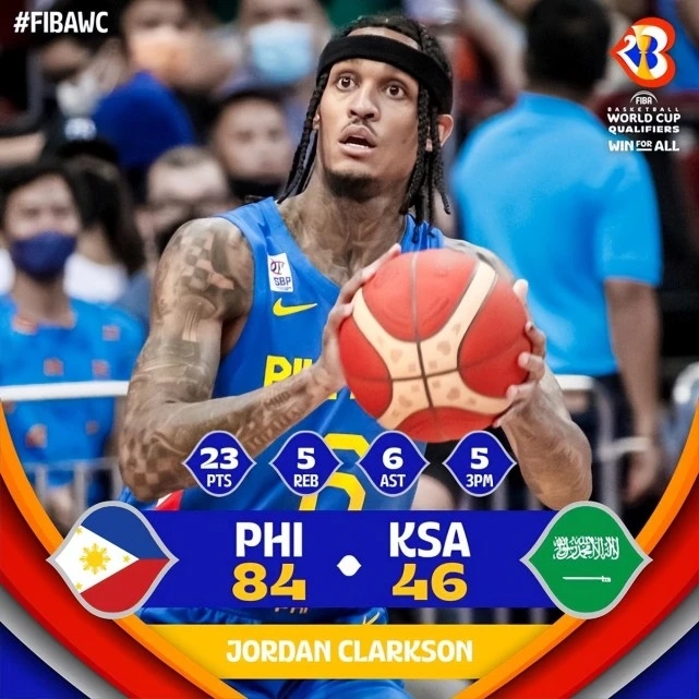 这场比赛沙特首节还领先3分,但第二节菲律宾在克拉克森的带领下打出26-14的冲击波一局逆转局势,第三节菲律宾更是一波24-8将比赛打入垃圾时间,最终菲律宾大胜沙特。NBA现役球员乔丹-克拉克森完完全全是降维打击,全场比赛28分钟,14中8,三分8中5拿下23分6助攻5篮板;有菲律宾周琦之称的凯-索托14分13篮板4盖帽。