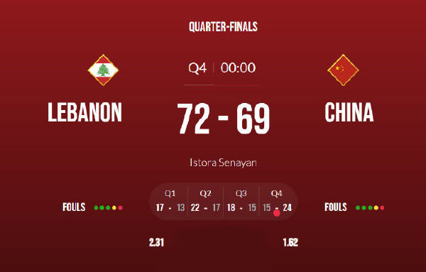 黎巴嫩男篮:阿拉基32分2篮板、阿利奇16分11篮板、达维奇10分6篮板3助攻3抢断、查蒙6分、约克钦5分6篮板3助攻2抢断、伊泽迪内3分4篮板2助攻2抢断