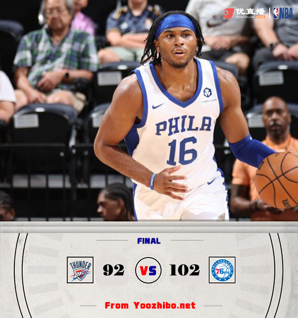 24直播网讯 7月9日 NBA盐湖城夏季联赛,雷霆今日对阵76人。比赛上来,雷霆就率先进入状态打出10-2的开局取得领先,不过及时调整的76人在首节后半段逐渐追了回来,首节双方战至26-26平,次节双方依旧是大打对攻战,但76人显然攻势更猛单节砍下32分,半场结束时雷霆落后7分;下半场回来,双方的命中率都出现下降,不过分差一直保持在十分左右,到了末节76人率先找回进攻感觉,他们没有给雷霆任何迫近比分的机会,最终76人轻取雷霆迎来开门红。