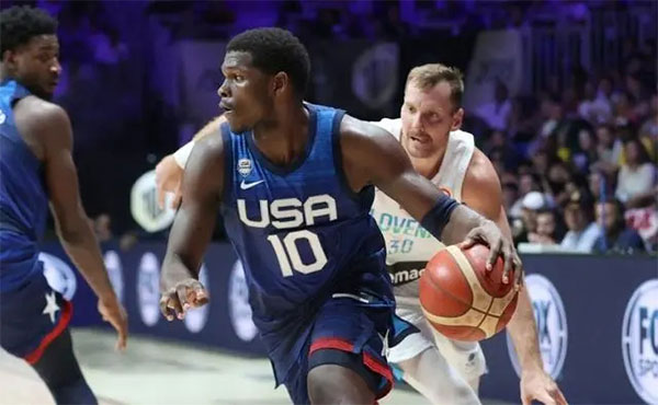 24直播网讯 北京时间8月13日,世界杯热身赛继续进行,美国男篮92-62大胜斯洛文尼亚男篮,热身赛2胜0负。东契奇因前一场左膝受伤,出于预防原因考虑,他缺席本场比赛,爱德华兹得到美国队最高的15分。此前的一场热身赛,美国男篮以43分的优势击败波多黎各。