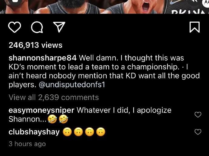 近日评论员Shannon Sharpe在节目中抨击杜兰特抱团“杜兰特当时去金州勇士,那是斯蒂芬的球队;而之后他来到篮网,我原以为这是他和欧文的球队,现在突然之间就变成了杜兰特、哈登、欧文、格里芬、小乔丹。人们总是在批评詹姆斯抱团,我却从来没有听说过‘杜兰特也很想要所有的强大队友’的说法呢?”