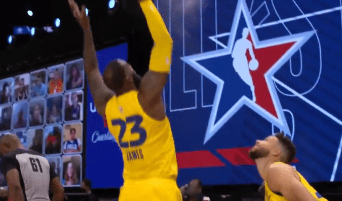 从比赛初期,刚刚拿下三分球大赛的库里和詹姆斯就有意连线,其中库里摘板之后长传球就是找的詹姆斯,可惜詹姆斯没有防守的情况下失误出界了。当库里投进空位三分球之后,两人在回防的时候也是兴奋庆祝。