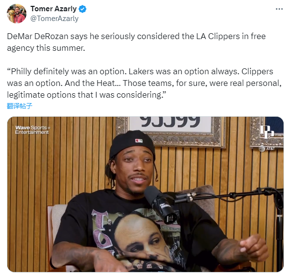 24直播网讯 北京时间9月10日,国王新援德马尔-德罗赞透露,今年夏天他认真考虑过加盟湖人、快船等队;在做客保罗-乔治的节目,德罗赞表示:我考虑了费城。费城绝对是个选择,湖人一直都是个选择,快船也是个选择,还有热火。这些球队,都是我考虑过的真正个人、切实的选择。