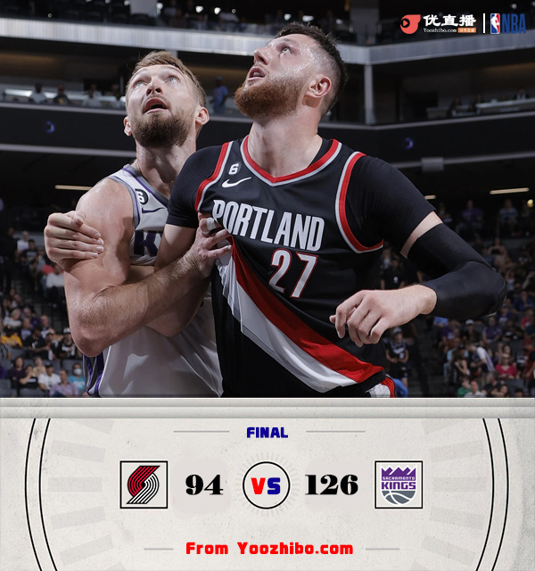 24直播网10月10日讯 NBA季前赛继续进行,开拓者客场挑战国王,比赛开始后两队早早进入状态,福克斯外线对飚西蒙斯,中段开拓者进攻断电,许尔特连中三分率队打出12-2攻击波,末段开拓者进攻再次停滞,萨博尼斯予取予求率队再次打出9-0小高潮,首节结束后国王确立12分优势,次节回来,开拓者找回进攻状态,两队你来我往火热对攻,努尔基奇联手西蒙斯不断追分,但国王多点开花总能及时回应,半场战罢,国王已经领先17分。易边再战后国王延续进攻火力,莱尔斯和蒙克轮番冲击,国王再度打出13-3攻击波,三节结束后国王将分差扩大到21分,末节上来,两队接连换上替补阵容,比赛提前失去悬念,最终国王126-94大胜开拓者。