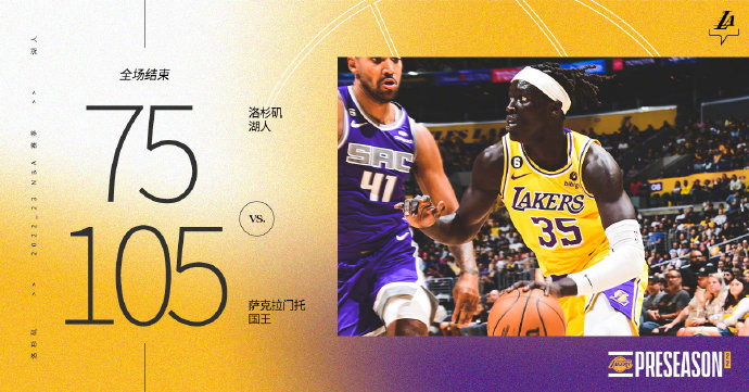 24直播网10月4日讯 NBA季前赛继续进行,湖人主场迎战国王。湖人围绕威少的交易讨论仍在继续,球队依然希望冲击总冠军。国王这边从目前来看距离季后赛有些遥远。一开场,湖人率先发力开局12-3领先,国王逐渐进入状态缩小分差,首节结束湖人领先6分。第二节,湖人在威少和浓眉的带领下始终保持微弱优势,国王努力追赶,半场战罢湖人46-41领先5分。詹姆斯半场7中0仅靠罚球拿到4分。下半场,湖人突然断电,国王轰出20-2的进攻狂潮领先17分进入末节。第四节,国王牢牢占据场上主动,没有给湖人翻盘的机会。最终,湖人75-105惨败国王,无缘季前赛开门红。