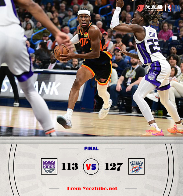 24直播网讯 2月12日 NBA常规赛,雷霆主场迎战国王,雷霆目前2连败后35胜17负排在西部第4位,国王则是30胜21负排在西部第5位。比赛开始,双方上来都迅速进入状态,小萨博尼斯继续有攻有传撑起球队进攻,蒙克替补上来状态上佳,而亚历山大则是状态火热单节砍下15分,首节雷霆领先15分,次节杰伦-威廉姆斯上来连续突内线砍下10分,雷霆顺势打出10-2进攻波一举拉开比分,随后双方围绕双位数分差展开拉锯战,半场雷霆领先10分。下半场,小萨里突外投连续追分后国王突然断电,雷霆众将多点开花,里突外投打出16-0超级攻击波一举拉开20分以上领先,又是蒙克连续远投止血,三节结束雷霆领先17分,末节国王上来下起三分雨一波14-5直接追至个位数分差,杰伦-威廉姆斯站出来连续中远投止血,亚历山大也是接连中远投稳住局势,雷霆牢牢守住双位数领先,最终雷霆127-113力克国王。